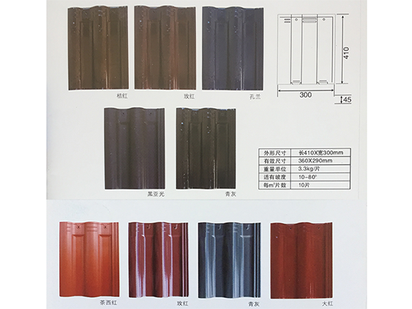 名稱:陶瓷彩瓦 顏色:玫紅、孔綠、孔藍、硒紅、深青灰、青灰、亞光、灰藍等(可定制顏色) 尺寸:370*250mm 405*270mm 厚:10mm 每平米用量:14片 鋪貼方式:水泥屋面鋪貼,木、鋼結構干掛都可以 吸水率 : <6% 抗凍性能:-25 產地:江蘇宜興市丁蜀 安徽宣城廣德縣