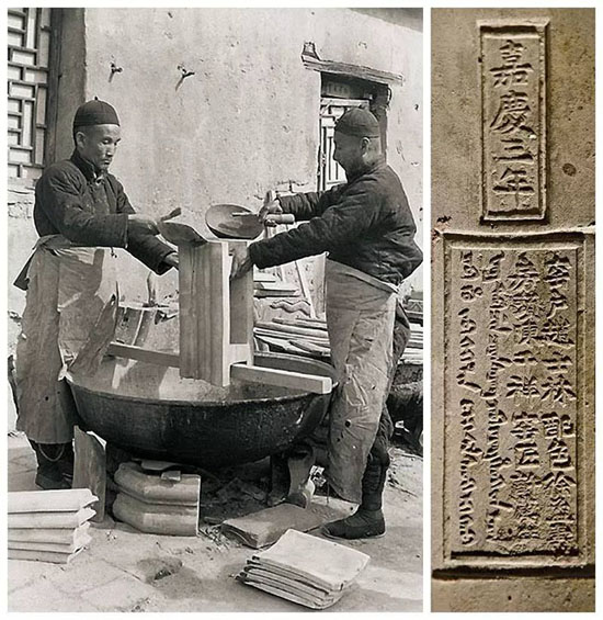 右圖瓦身背面有上下兩個長方形的戳記,上面的戳記寫著“嘉慶三年”,下面的寫著“窯戶趙士林、配色徐孟壽、房頭陳千祥、窯匠許萬祥”,旁邊尚有滿文對照。戳記除了說明琉璃的燒造年代,還證明琉璃渠官窯燒造有著明確的分工以及責任追認制度。