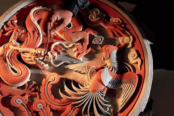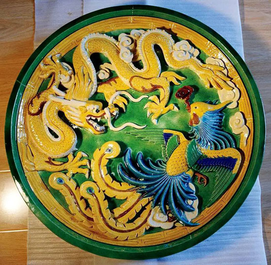 琉璃制品中,常常會有用于影壁等處的大型裝飾構(gòu)件。這張龍鳳大盤工藝精致,用色多達七種,有龍身的黃、背景的綠、靈芝的紫、祥云的白、鳳翅羽的藍、鳳頸的孔雀藍、鳳眼的黑。最奇妙的是,施釉前的顏色(上圖)與燒成的顏色(下圖)完全不同,讓人對傳統(tǒng)工藝的神奇變化油然而生敬佩之心。